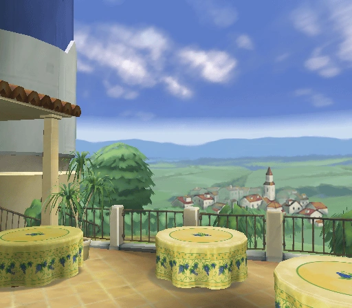 The TV Station is set up outside on an upper balcony behind Aki's laboratory. Dining tables are laid out with computer monitors and other objects to create a makeshift base of operations for Kei or Yumi to interact with, while Aki stands off to the side to give advice. In the back is a set of stairs leading down to the Shopping Area, which is implied to be part of the town that's visible in the distance.
